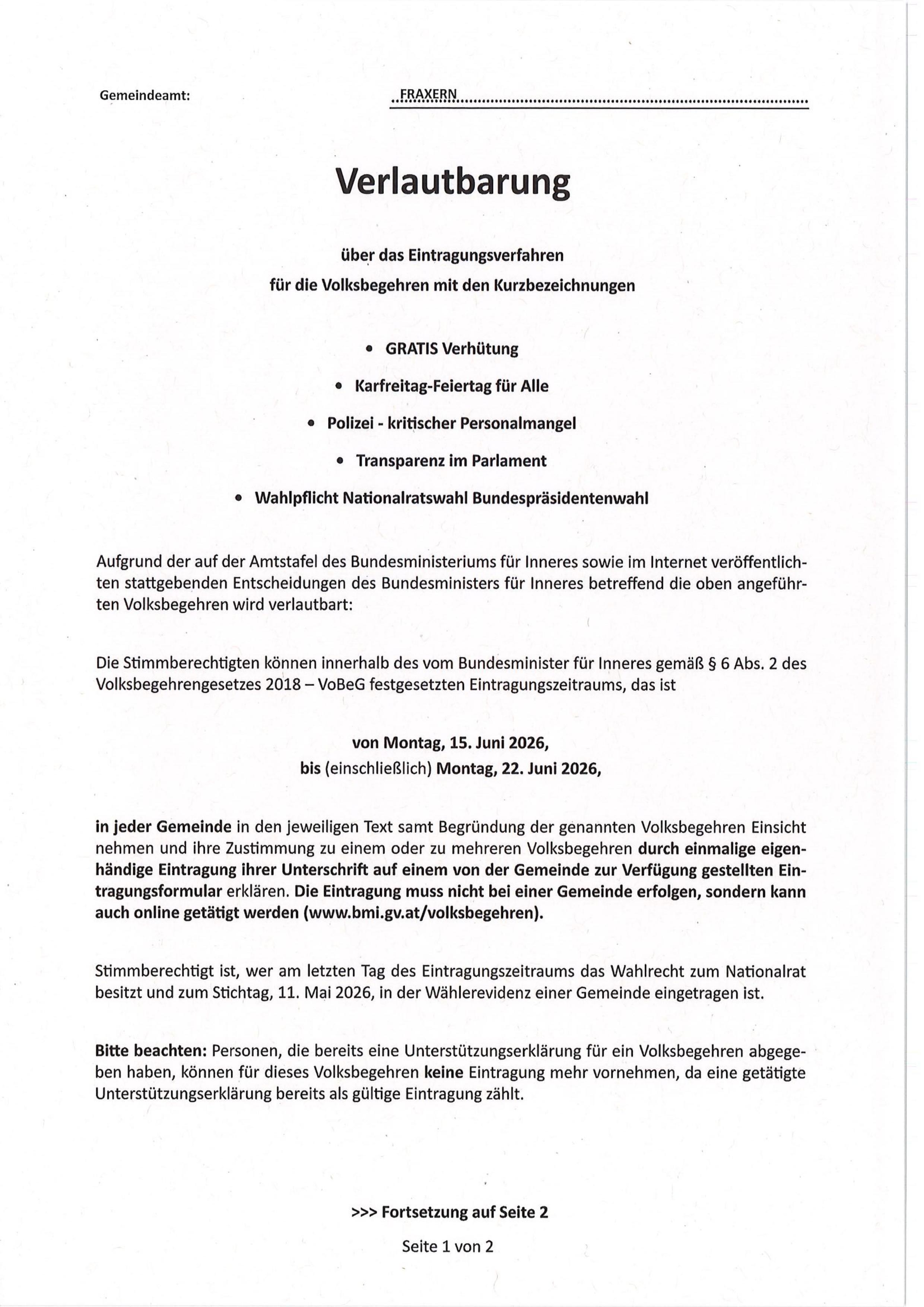 Verlautbarung über das Eintragungsverfahren für die Volksbegehren mit den Kurzbezeichnungen