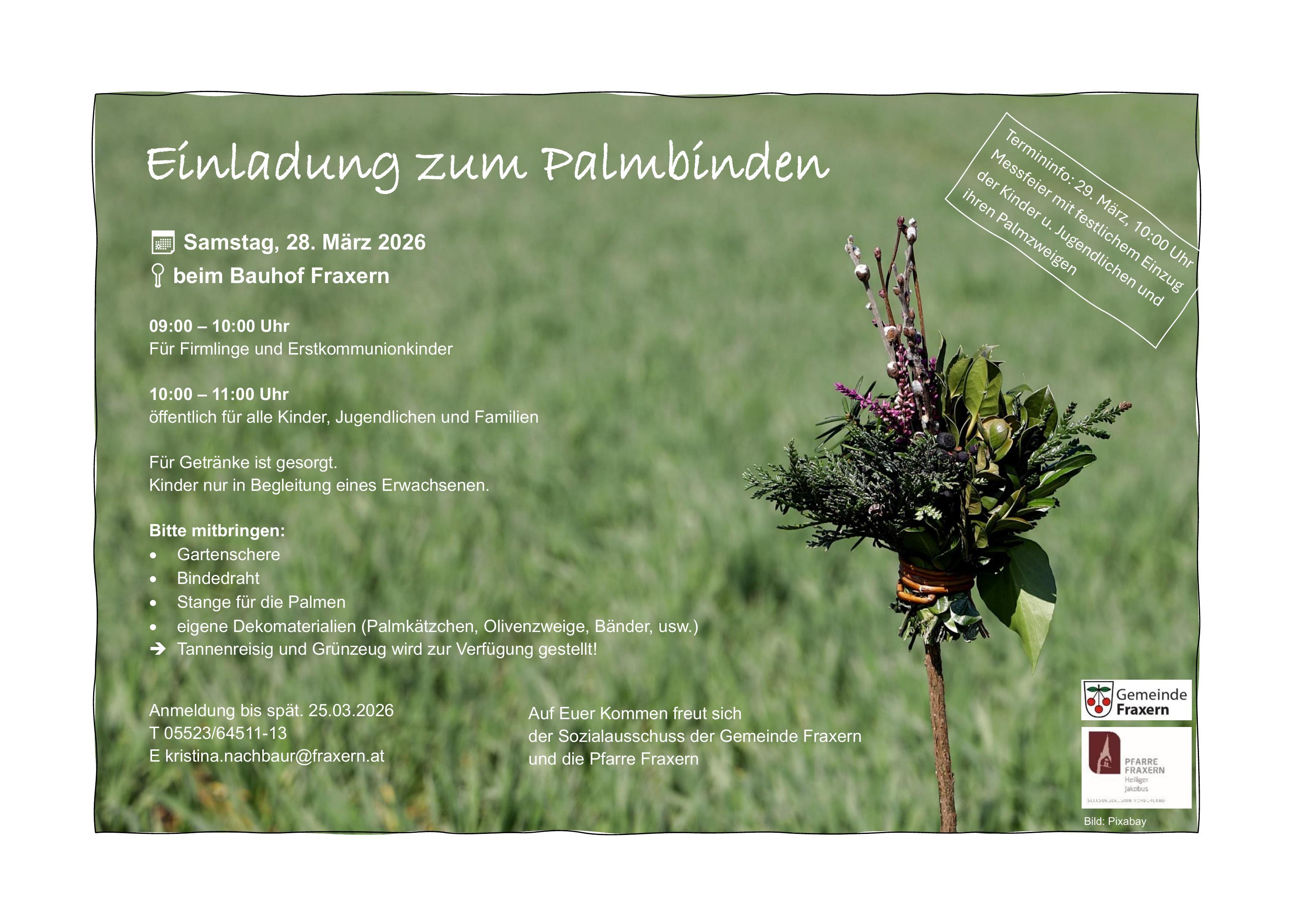 Die Pfarre Fraxern sowie die Gemeinde Fraxern laden herzlich zum gemeinsamen Palmbinden ein 🌿